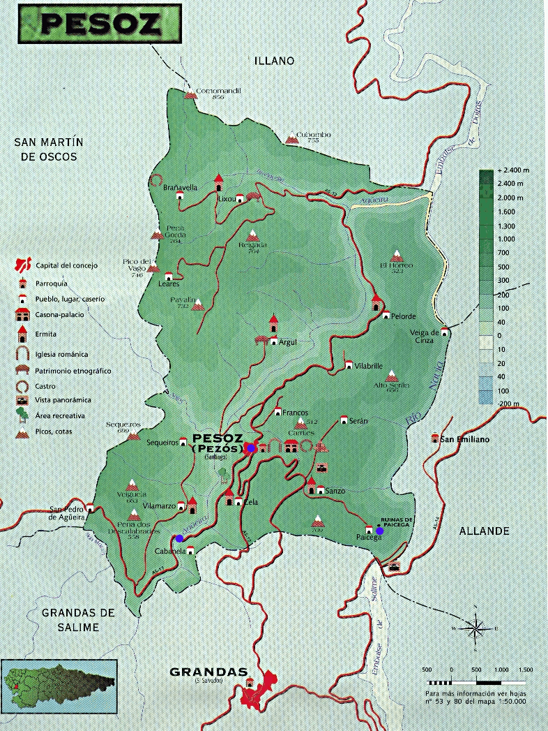 El concejo roza la desertización, aunque en 1950 llegó a tener 2.154 habitantes, coincidiendo con la construcción del embalse de Grandas. Muchos pequeños núcleos de población han quedado abandonados, como es el caso de Paicega, pequeña aldea construída para albergar en su momento a los trabajadores del embalse. Precisamente desde esta aldea tenemos algunas de las vistas más espectaculares del concejo. Santiago de Pesoz, iglesia originalmente románica y el Palacio de Ron, ambas en la capital, son sus dos patrimonios artísticos más destacables.